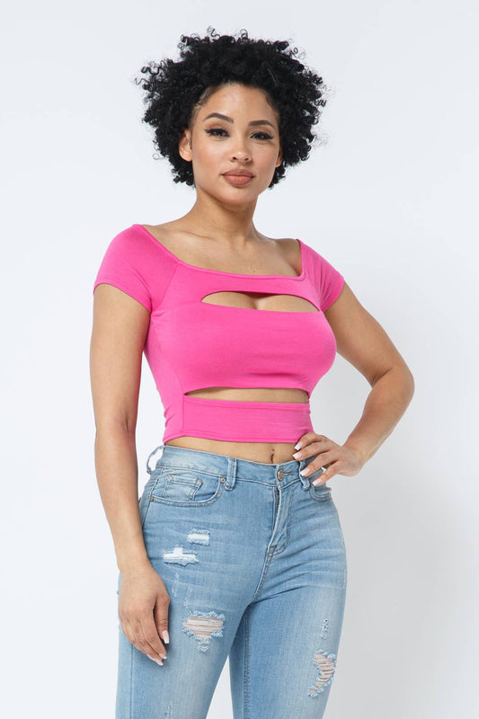 French Terry Solid Shoulder Cut Out Detail Half Sleeve Top- White