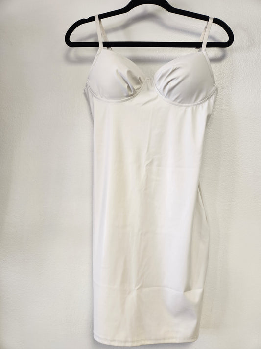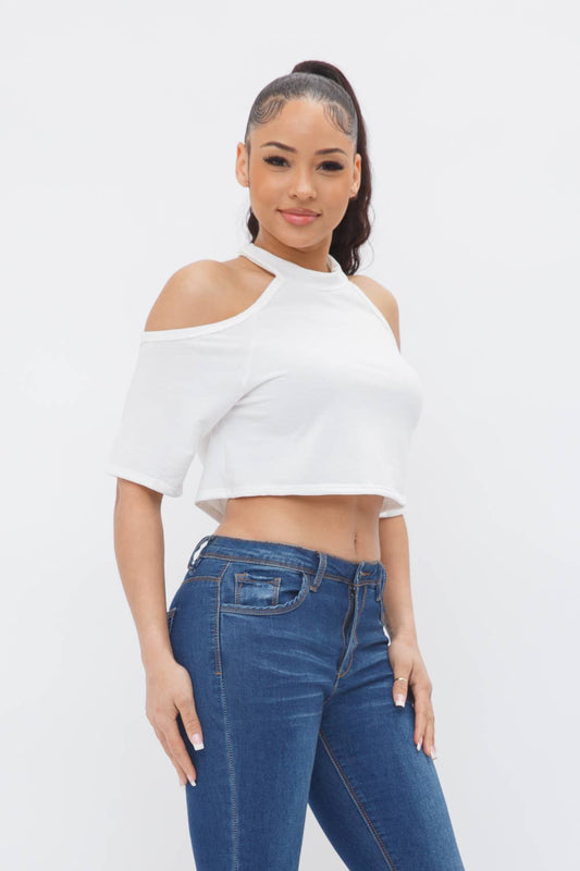 French Terry Solid Shoulder Cut Out Detail Half Sleeve Top- White